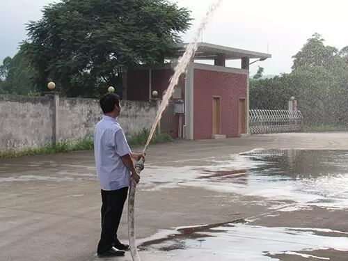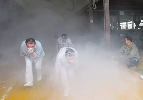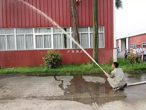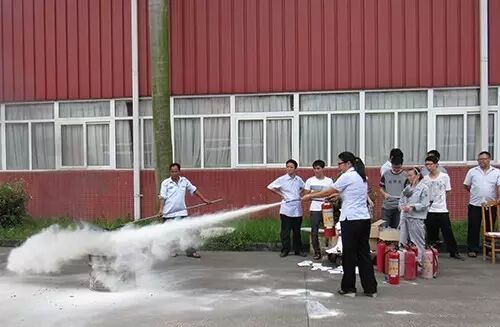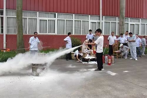 整體疏散到位后,參與人員到助劑二分廠混合車間門口外集合,進行干粉滅火器和消防水栓現場滅火演練。每個參與人員都要親手試一次使用方法。