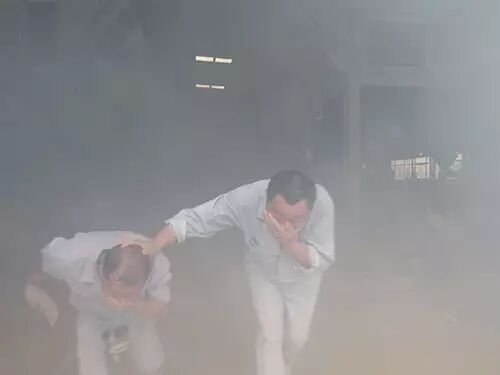 火災發生時,煙霧是致命的有害氣體,為了減少吸入,疏散人員應用濕毛巾捂住口鼻或戴防毒面具以盡量下蹲姿勢快速疏散離開